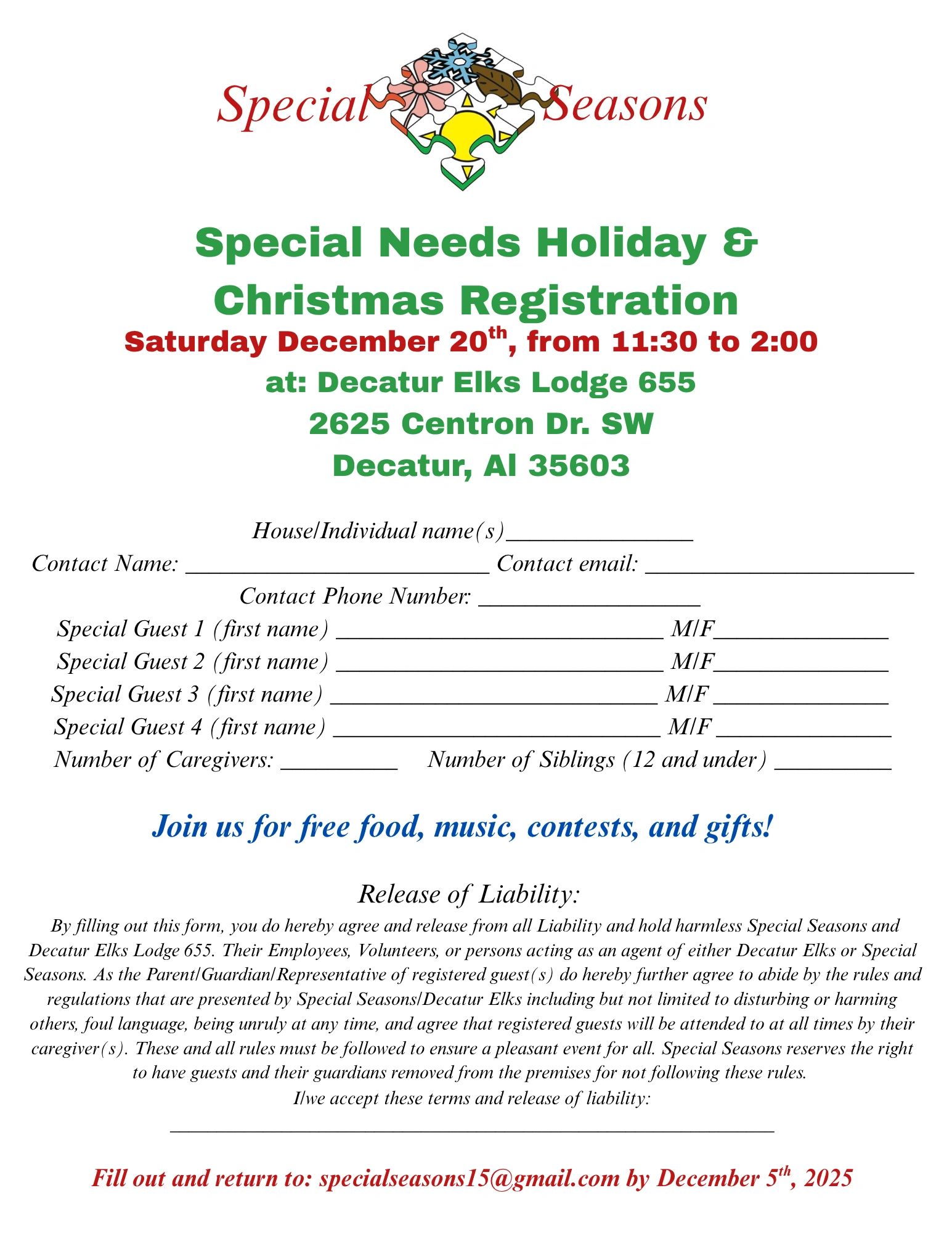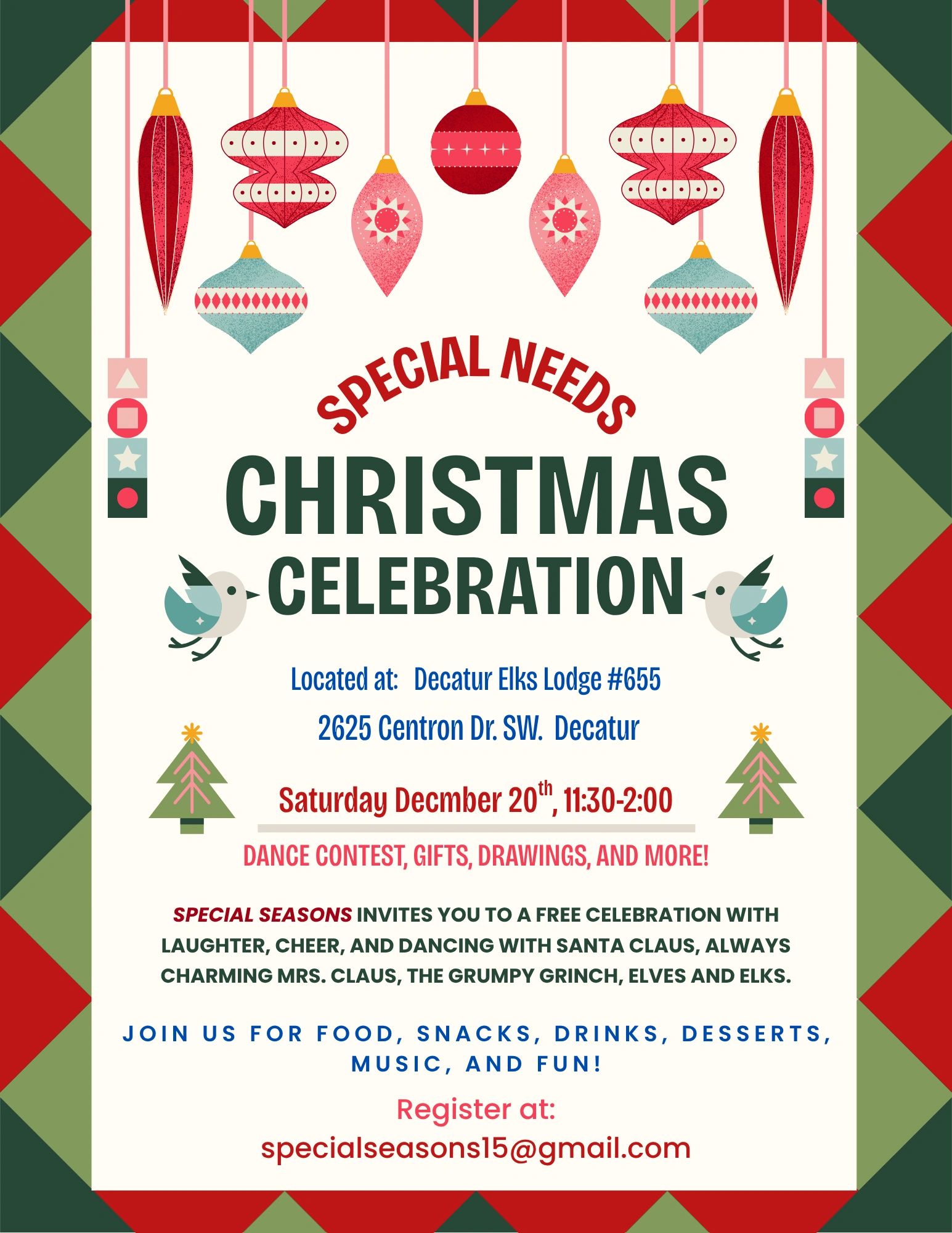 Thank you to all our sponsors, volunteers & especially to our new friends at Decatur Elks Lodge 655! You helped us at Special Seasons have a wonderful fundraising event to support our Special Needs Christmas Celebration for 2025!